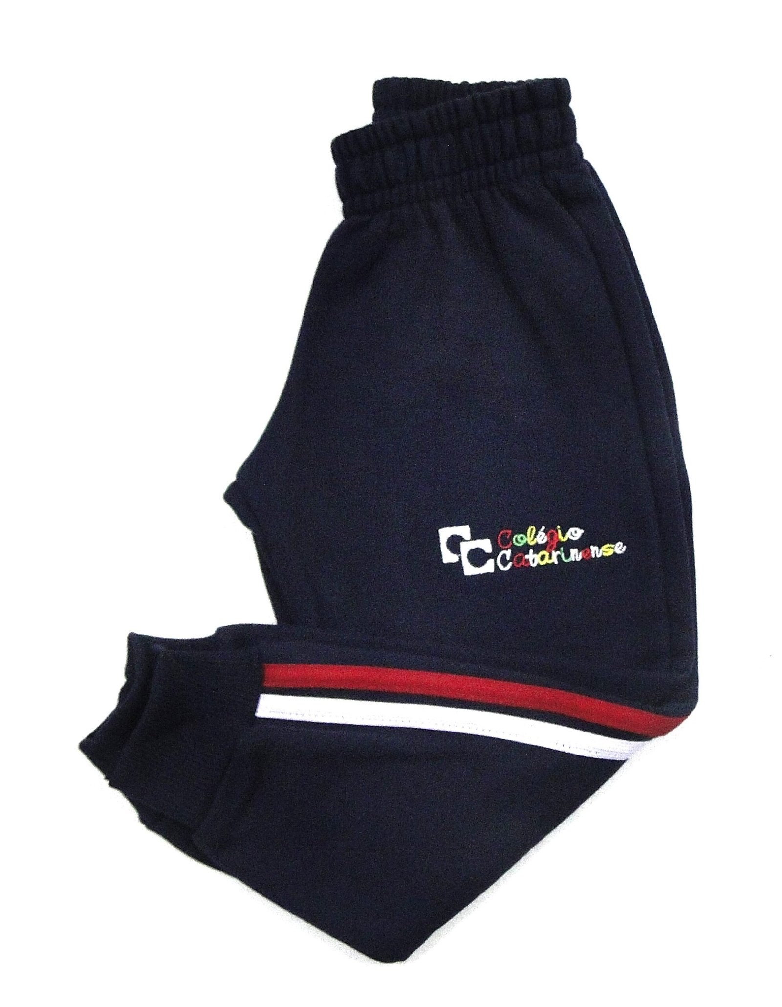 Calça de moletom peluciado 2 cabos 50% algodão 50% poliéster, com bolso de zíper e detalhe de viés vermelho e branco lado direito, logo bordado lado esquerdo. Acabamento com punhos de ribana na bainha. Tamanhos PP e P infantil sem bolso |